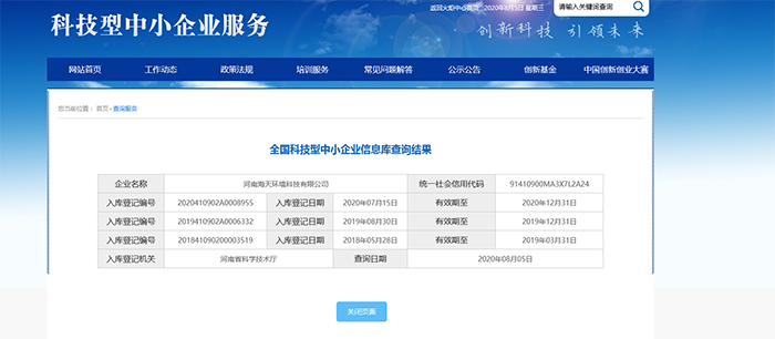 7月15日,經(jīng)河南省科學(xué)技術(shù)廳審核公示,河南海天環(huán)境科技有限公司成功入庫科技型中小企業(yè)信息庫。